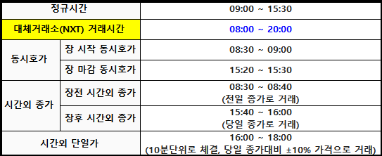 기존 한국거래소(KRX)의 정규장과는 다른 시간대에 운영됩니다.