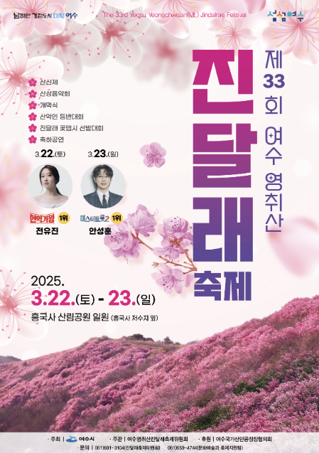 2025년 여수 영취산 진달래축제가 3월 22일부터 23일까지 전라남도 여수시 흥국사 산림공원 일원에서 개최되며, 우리나라 3대 진달래 군락지 중 하나인 영취산의 아름다운 풍경을 즐길 수 있는 축제입니다.