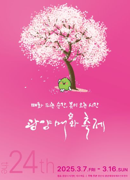 2025년 광양 매화축제가 3월 7일부터 16일까지 전라남도 광양시 다압면 매화마을 일원에서 개최되며, 약 198,000㎡ 규모의 매화 군락지에서 아름다운 봄 풍경을 감상할 수 있습니다.