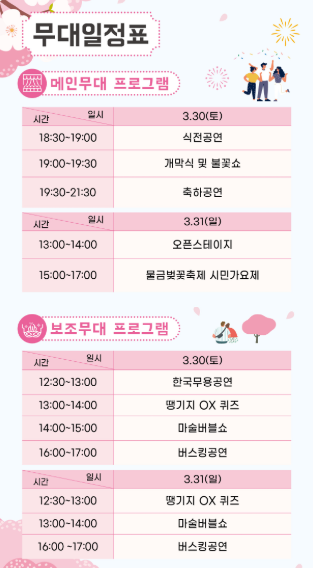 - 체험 프로그램: 벚꽃 카나페 만들기, 박하벚꽃향주머니 만들기 등