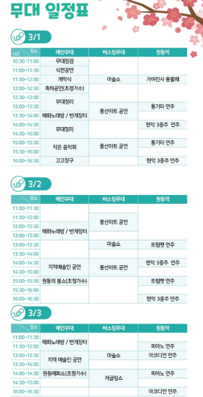 - 개막식: 3월 1일(토) 11:30 (메인무대)