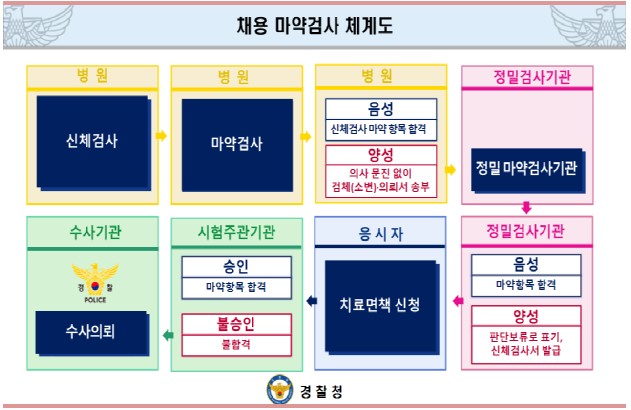 - 기존 경찰 채용 신체검사 시 실시하는 TBPE 검사를 대표 마약 6종 검사로 확대하여 시행하며, 개선된 마약검사가 가능한 병원에서만 채용 신체검사가 가능합니다.