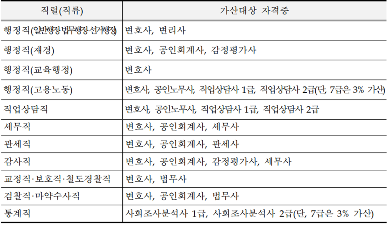 - 행정직 : 다음 직렬의 응시자가 직렬별 해당 자격증을 소지하고 있을 경우, 과목별 만점의 40% 이상 득점한 자에 한하여 과목별 득점에 과목별 만점의 5%에 해당하는 점수를 가산합니다.