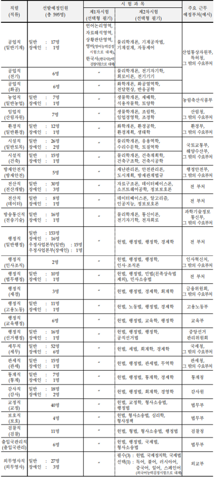 선발 직렬(직류) 및 선발예정인원은 정부의 인력운영 사정에 따라 매년 변경될 수 있어 확정된 사항은 사이버국가고시센터(www.gosi.kr)를 통해 공고됩니다.