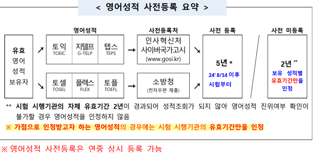 ※ 소방공무원 채용시험의 영어과목을 대체하는 영어능력검정시험의 성적 인정기간을 연장할 수 있는 '영어성적 사전등록'은 필수임.