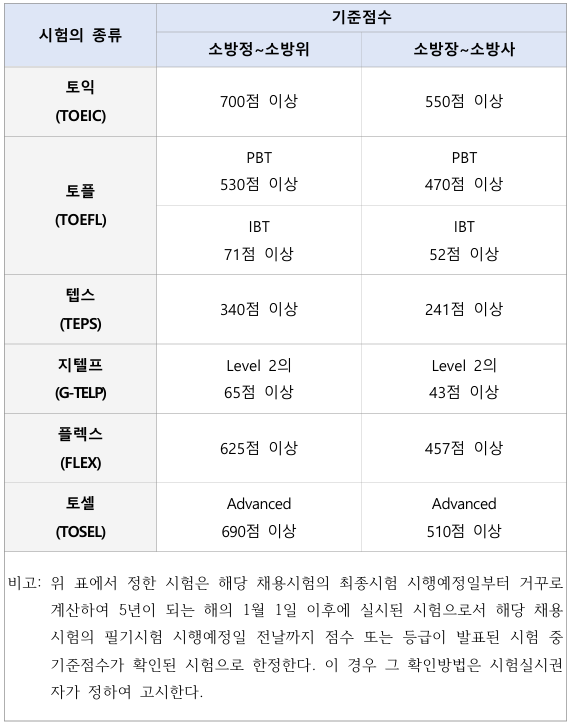 - 2024년 8월 14일부터 소방청에서 주관하는 소방공무원 채용시험의 영어 과목을 대체하는 영어 능력검정 시험과 가점에 해당하는 한국어 및 외국어 능력검정 시험의 성적인정 기간을 5년으로 확대하였습니다.