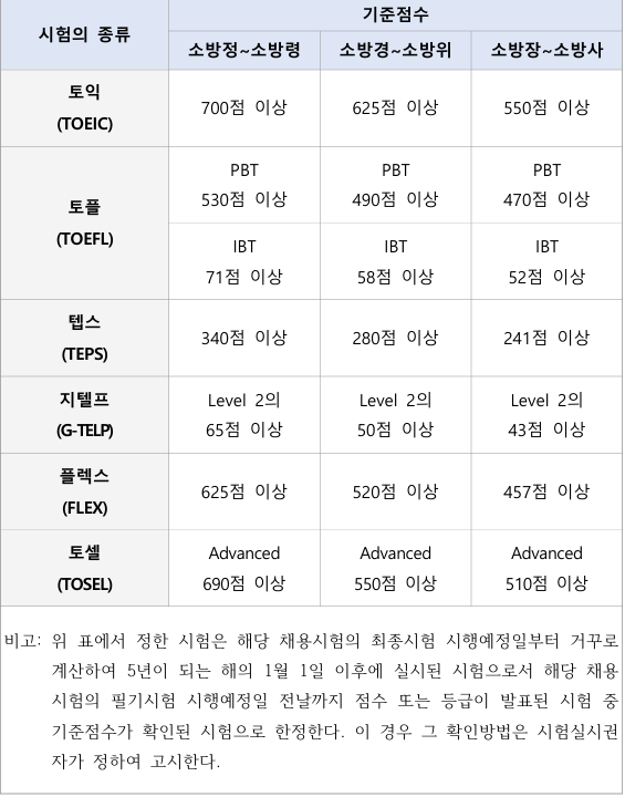- 소방위 · 소방경의 영어능력검정시험의 토익점수를 625점에서 700점으로, 텝스는 280점에서 340점 이상 등으로 상향 (2025년 11월 1일부터 시행)