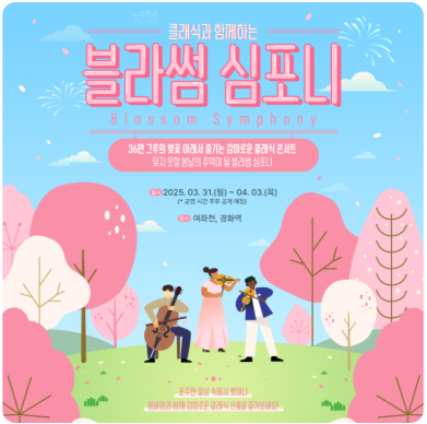 - 내용: 36만 그루의 벚꽃 아래에서 즐기는 감미로운 클래식 콘서트, 블라썸 심포니 분주한 일상 속에서 벗어나 봄바람과 함께 감미로운 클래식 선율을 즐겨보세요!