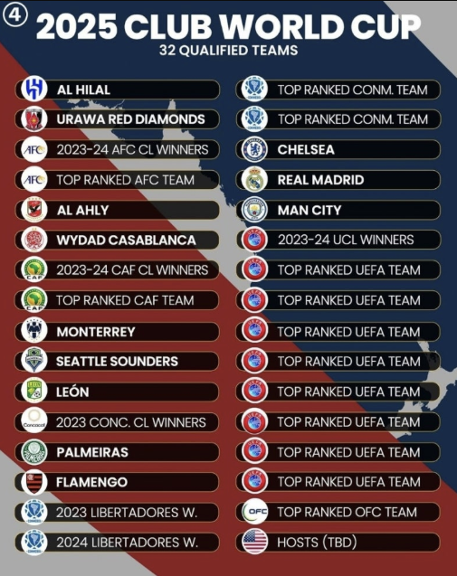 - 대회 기간: 2025년 6월 15일 ~ 7월 13일 (현지 기준) 조추첨: 2024년 12월 6일 예정 기타 특징 및 이슈 이번 대회는 선수 혹사 및 일정 과다에 대한 우려가 제기되고 있으며, FIFA는 각 팀에 경기 사이 최소 3일 휴식 보장을 약속했습니다.